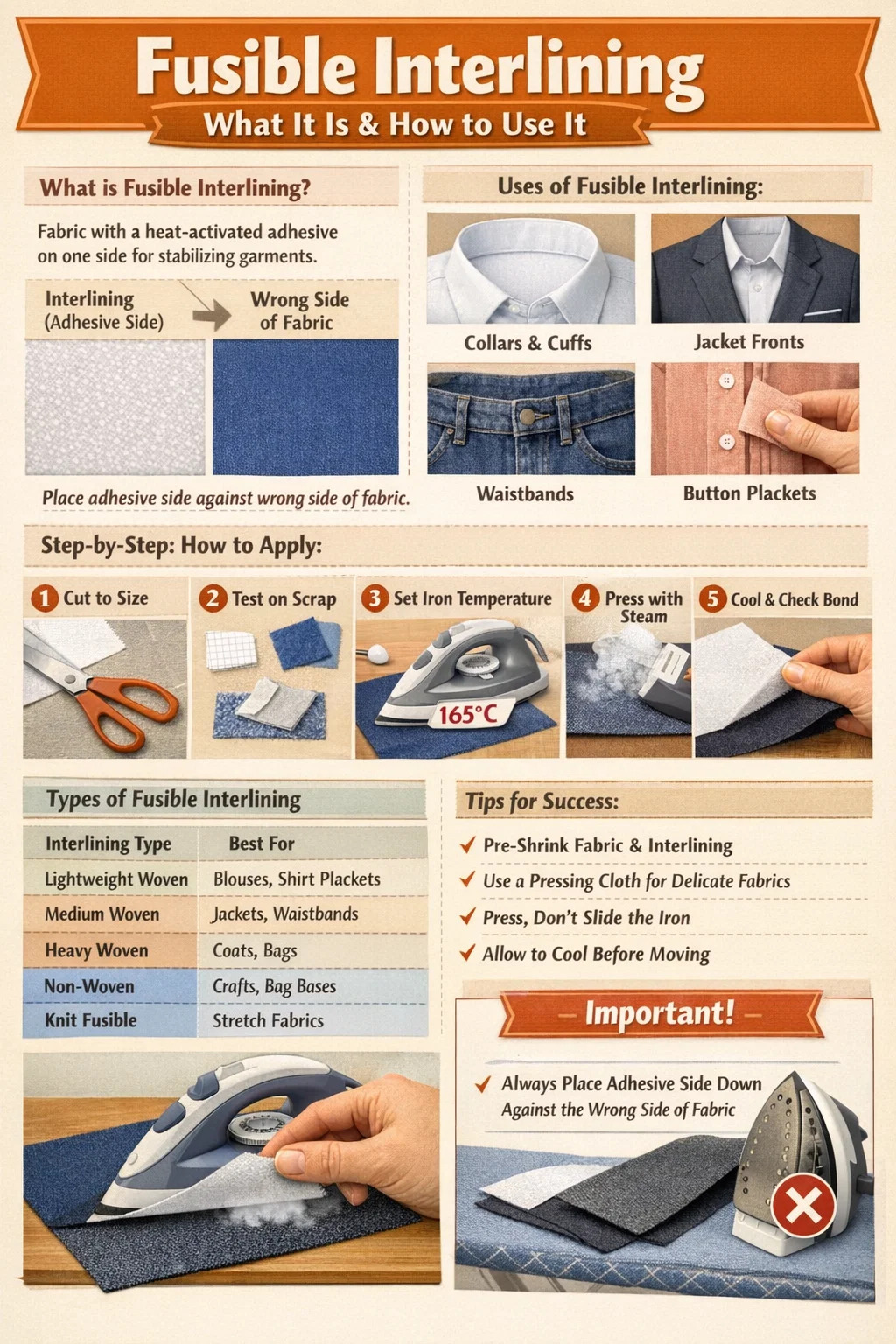| Niet-geweven smeltbaar | Knutselprojecten, tassenbodems | Katoen, denim | 150–165°C |