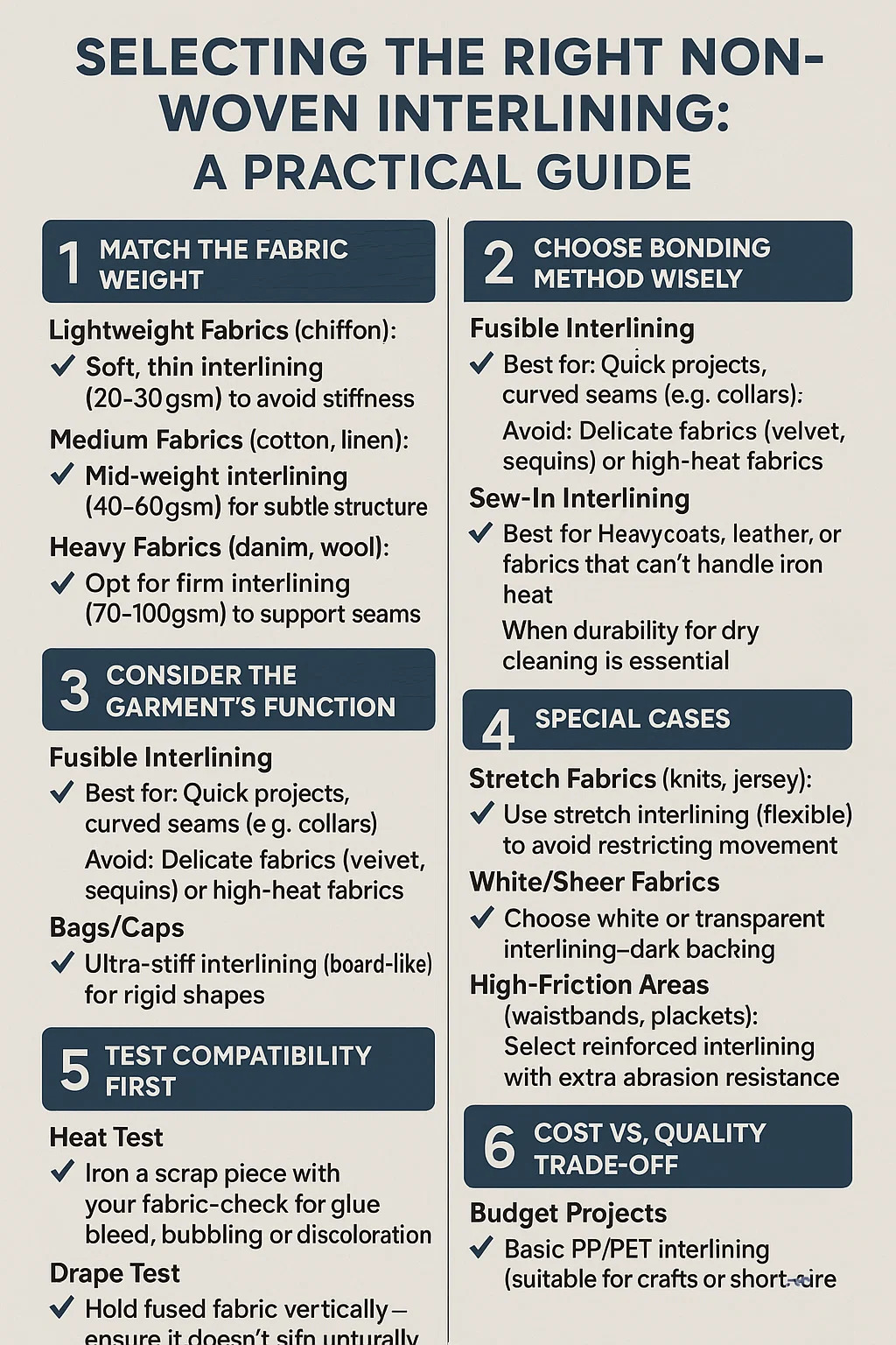 Lichtgewicht stoffen (chiffon, zijde): gebruik zachte, dunne interlinering (20-30GSM) om stijfheid te voorkomen.