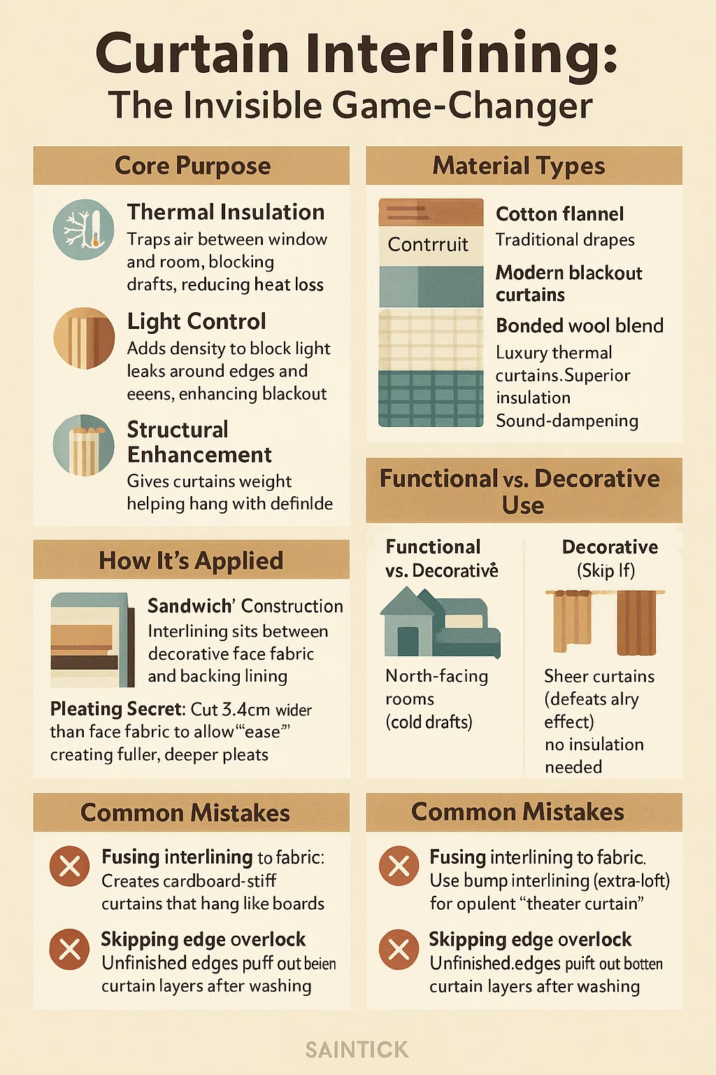 Color Matters: Gebruik wit/crème tussenvoering achter lichte stoffen—donkere soorten schaduw door linnen of zijde.