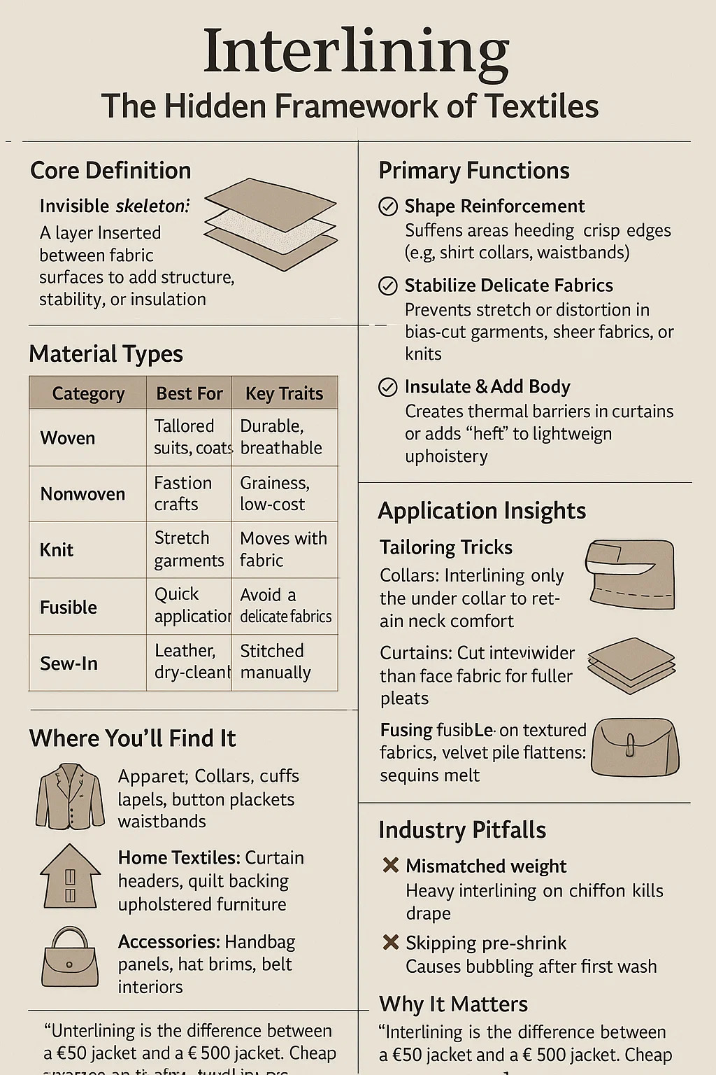 "Interlining is het verschil tussen een jas van € 50 en een jas van € 500. Goedkope versies scheuren na stomerij; luxe types overleven de buitenste stof." - Op maat gemaakte kleermaker, Milaan