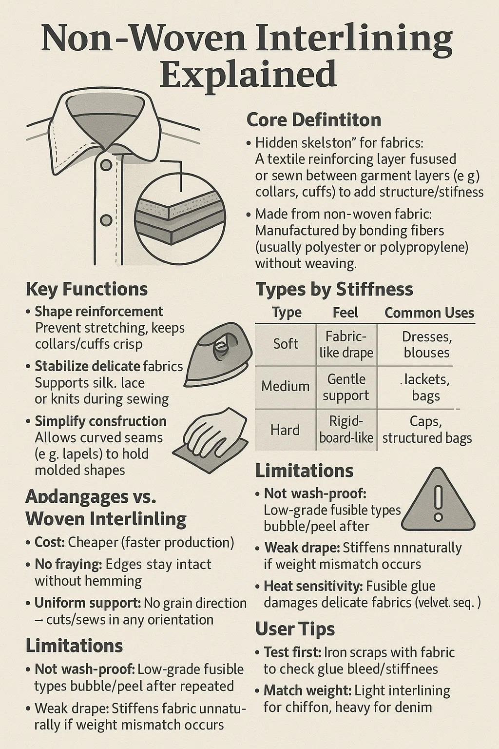 "Hidden Skeleton" voor stoffen: een textielversterkingslaag versmolten of genaaid tussen kledinglagen (bijvoorbeeld kragen, manchetten) om structuur/stijfheid toe te voegen.