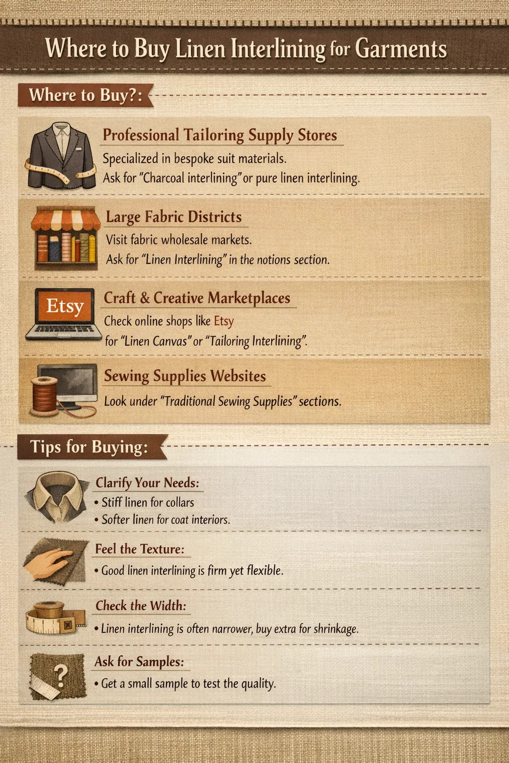 Als u linnen wilt kopen tussenvoering of interfacing voor het maken van kleding, er zijn verschillende betrouwbare bronnen die u kunt verkennen. Omdat linnen een relatief hoogwaardig materiaal is dat wordt gebruikt in maatpakken en hoogwaardige confectiekleding, moet je in gespecialiseerde stoffenwinkels kijken.