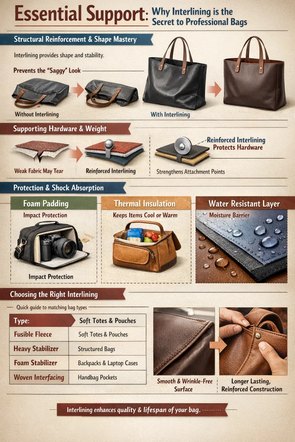 De belangrijkste reden om te gebruiken tussenvoering in de zakconstructie is te voorzien structurele integriteit en langdurig vormbehoud die stof alleen niet kan bereiken. Zonder deze verborgen laag zouden de meeste tassen bezwijken onder hun eigen gewicht of het gewicht van de spullen die erin zitten, waardoor ze er slap, gekreukeld en onafgewerkt uitzien. Door het juiste toe te voegen tussenvoering Transformeer je een eenvoudig stuk stof in een functioneel 3D-object dat rechtop staat, de inhoud beschermt en bestand is tegen de ontberingen van het dagelijks gebruik.